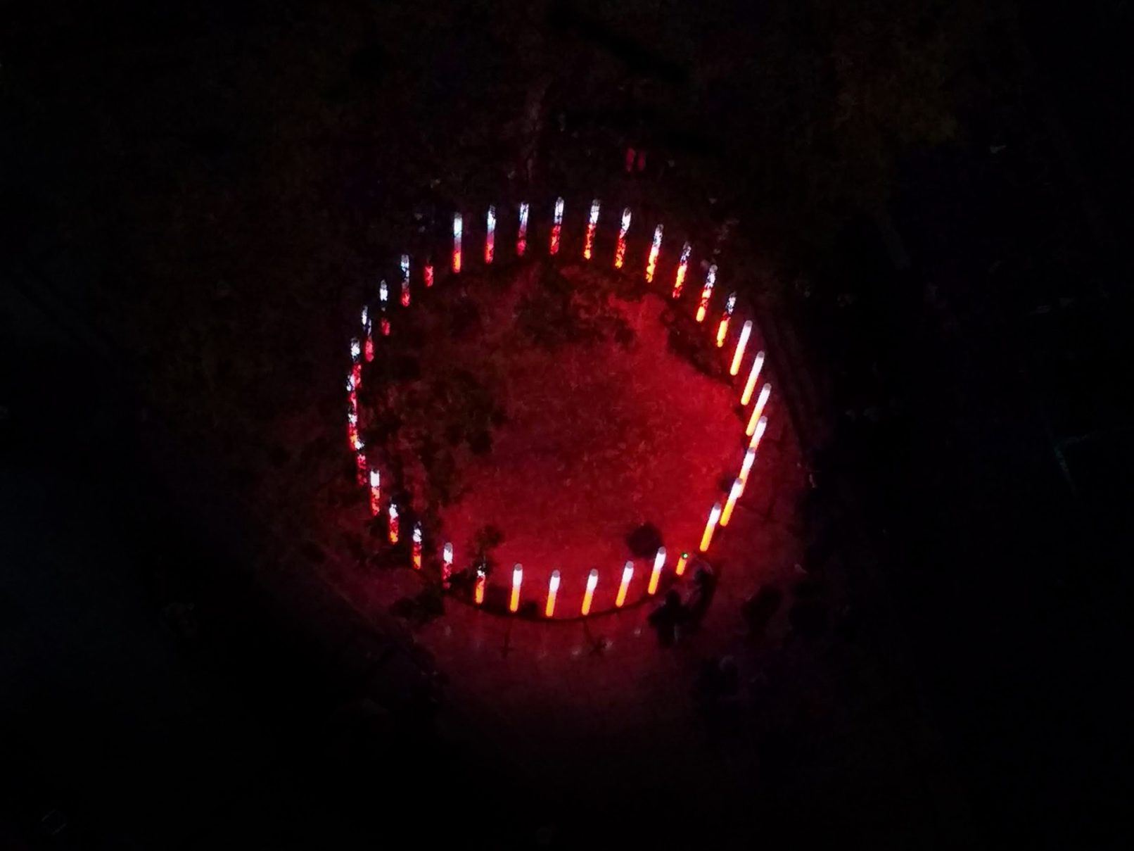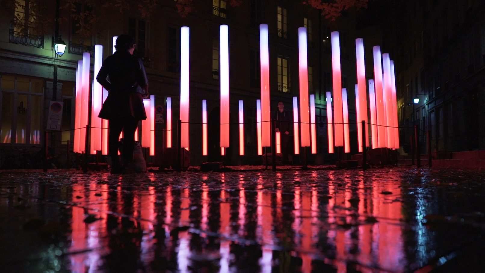 Rythmus metamorphoses this individual physiological phenomenon into a shared experience. These exchanges, this biometric dialogue, generates sound and light rhythmics on the structure and the space in which the installation is staged. The device thus creates a union between the two users, the organic structure, the public and the surrounding space.